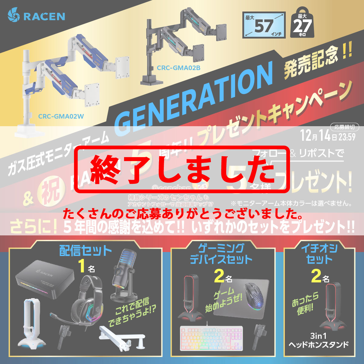 『ガス圧式モニターアーム「GENERATION」発売記念!! & 祝!RACEN 5周年!! プレゼントキャンペーン』開催のご案内