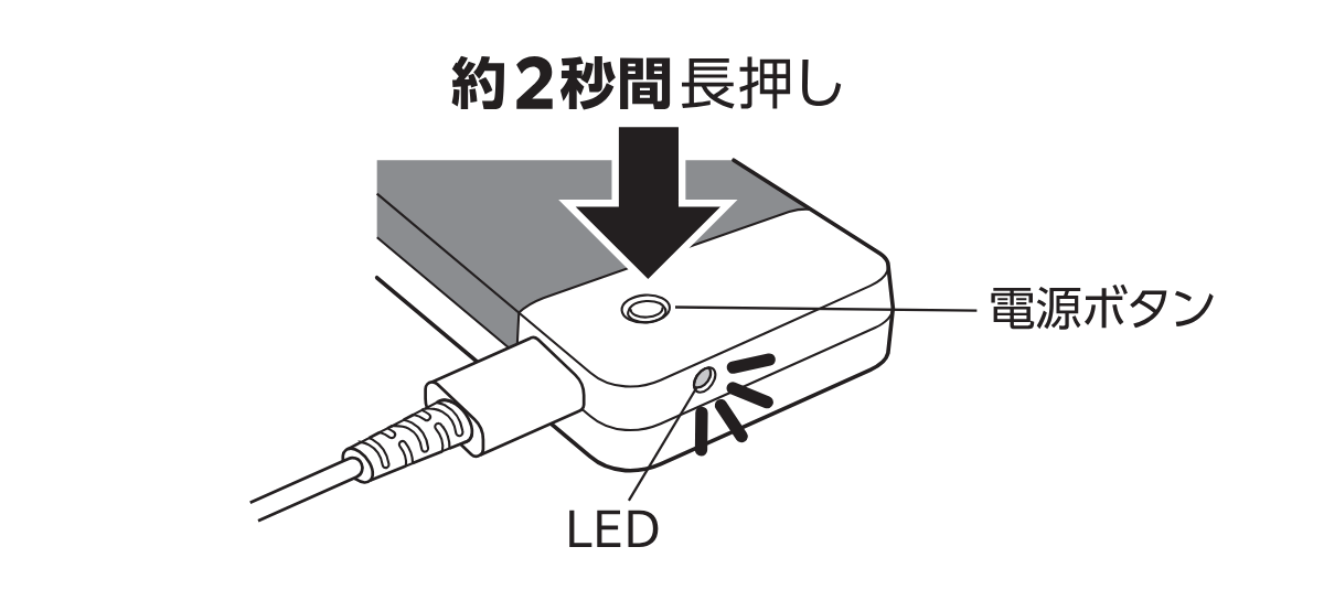- 電源ボタンを長押し(約2秒間)するとLEDが点灯し、充電が開始されます。