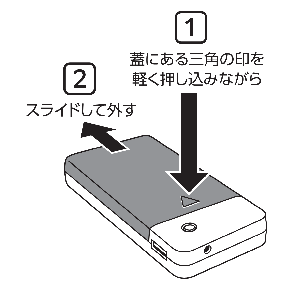 - 電池蓋を装着します。 ※閉める時は、カチッと音がするまで電池蓋を本体に差し込んでください。