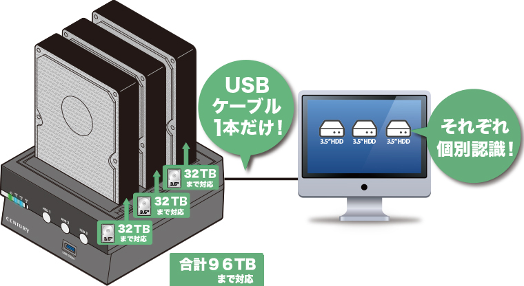 最大3台のSATA HDD/SSDを裸のまま差し込み、外付けでPCと接続