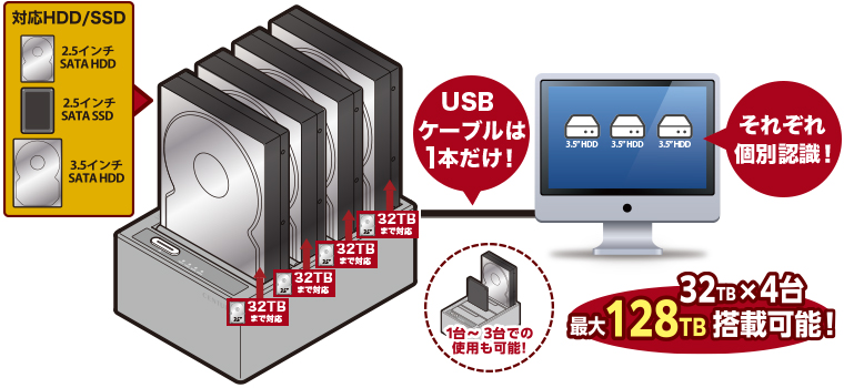 - 最大4台のSATA HDD/SSDを裸のまま差し込み、外付けでPCと接続