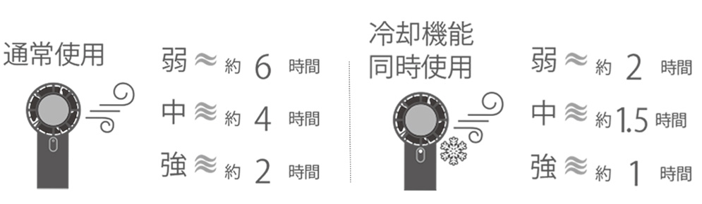 【通常使用】(弱)約6時間、(中)約4時間、(強)約2時間 【冷却機能同時使用】(弱)約2時間、(中)約1.5時間、(強)約1時間 |