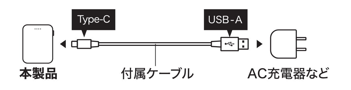 - 付属ケーブルのUSB-AコネクタをUSB-AC充電器(別売)に接続し、USB-A充電器を家庭用コンセントに接続します。