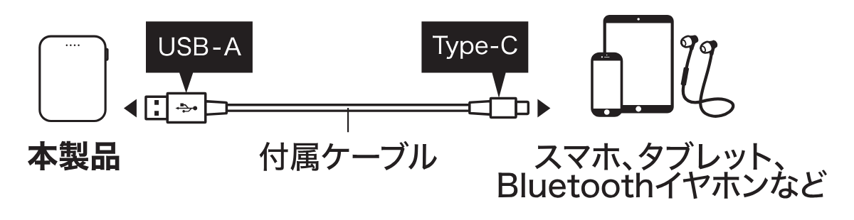 - 付属ケーブルを充電したいスマートフォンに接続し、USB-Aコネクタを本製品のUSB-Aポートに接続すると、充電が始まります。