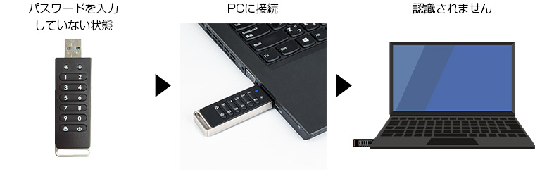 ロックが掛かった状態でPCに接続してもUSBメモリは認識されません。