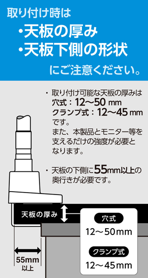 ※取り付けるモニターによっては、VESAヘッドがモニターの取り付け穴近辺のベゼルやコネクタなどに干渉する場合があります。 - 対応天板厚:クランプ式12 ~ 45mm / 穴式12 ~ 50mm