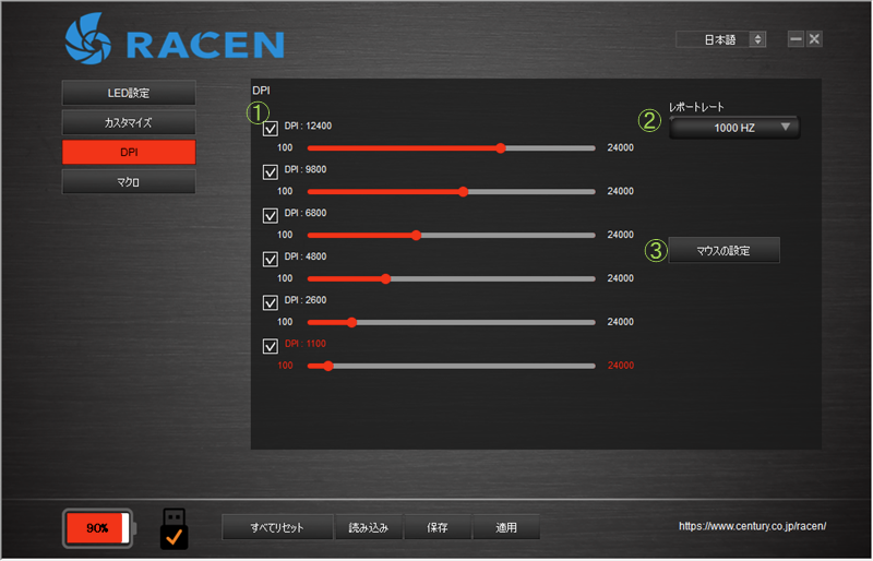 ※下に行くほど小さくなるように設定すると、「カスタマイズ」の項目で「DPI+」「DPI-」のボタンを設定した場合に便利です。