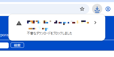 - 「不審なダウンロードをブロックしました」という警告が表示されますので、右側の「>」マークを左クリックします。