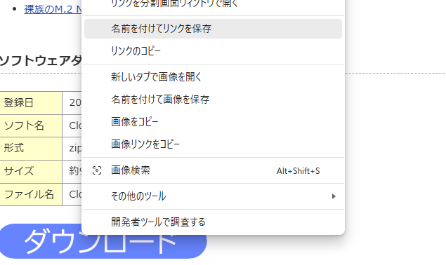 - ダウンロードのところにマウスのカーソルをあわせて右クリックし、『名前を付けてリンクを保存』を選択します。