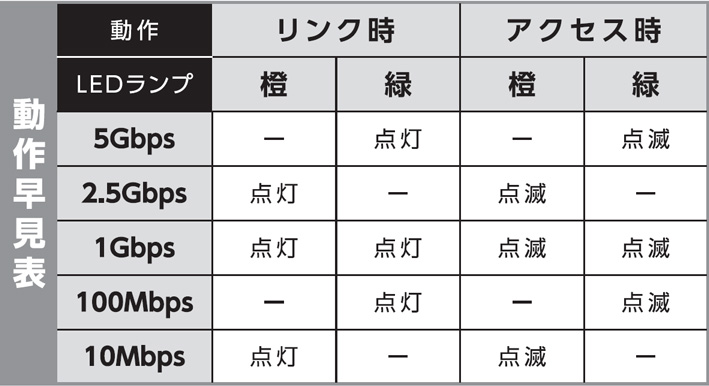 LEDランプの挙動は下記の動作早見表のとおりとなります。